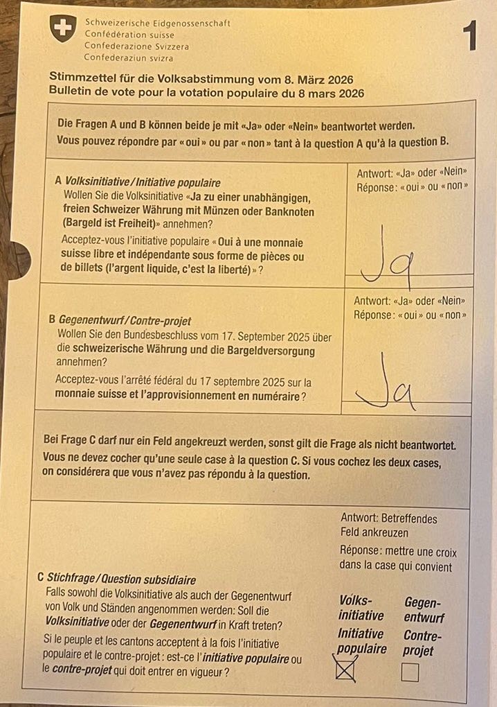 - Ja zur Bargeld-Initiative und dem Gegenentwurf, „Volksinitiative“ bei der Stichfrage